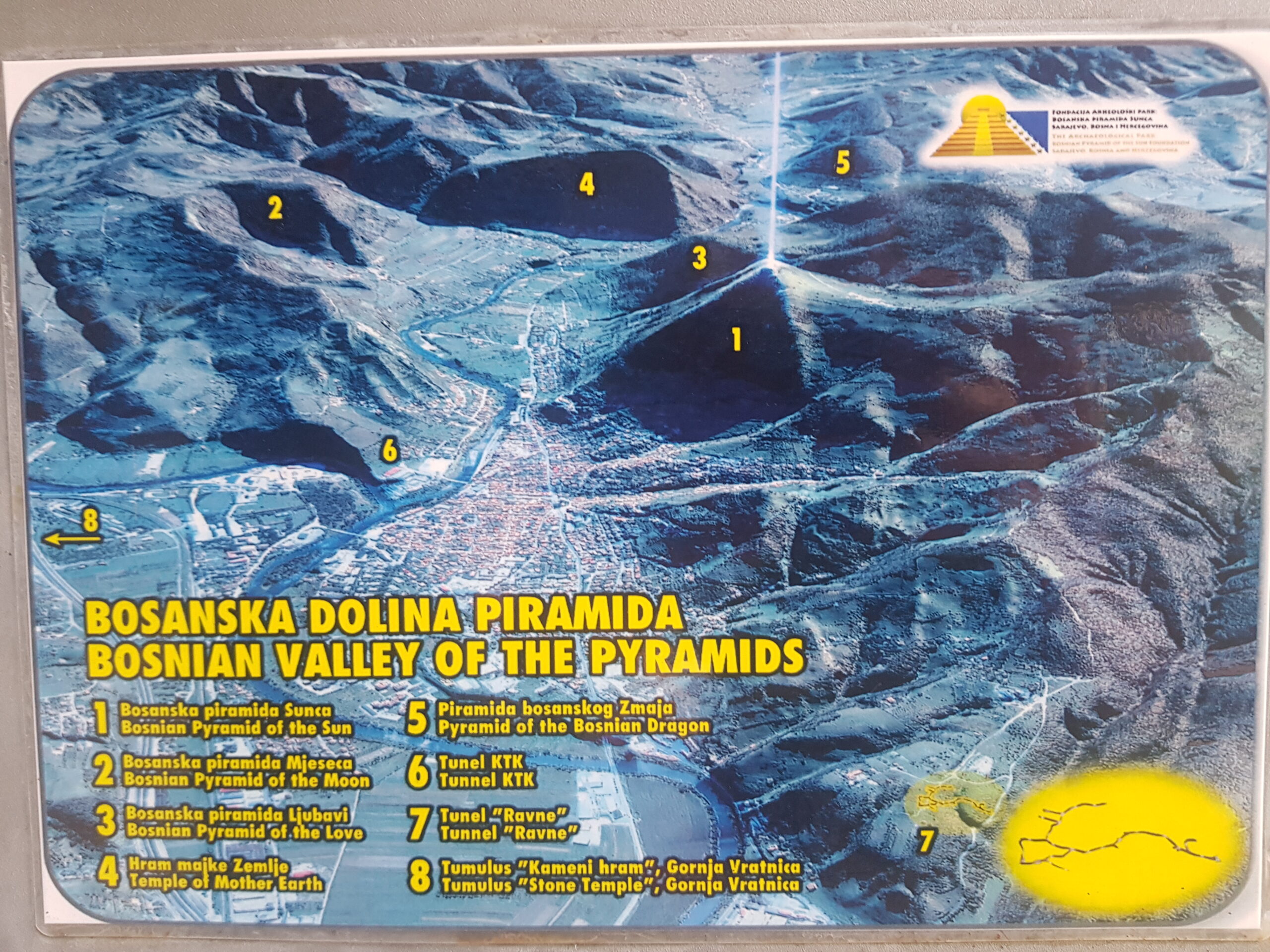 „Pyramiden mitten in Europa? Das kann doch wohl nicht sein, oder etwa doch …? In der Nähe der Stadt Visoko, nordwestlich von Sarajevo, ragt mit 220 Metern Höhe die Sonnenpyramide aus dem Landschaftsbild hervor. Insgesamt stehen fünf Pyramiden in kosmischer Verbindung miteinander, gebaut nach dem Goldenen Schnitt mit heiliger, sakraler Geometrie: Sonnenpyramide, Mondpyramide, Drachenpyramide, Tempel der Mutter Erde und die Pyramide der Liebe. Diese sollen mindestens 25 000 Jahre alt sein. Wegen ihrer bewachsenen Oberflächen blieben sie über die Jahrtausende unerkannt. Laut dem Entdecker, Dr. Semir Osmanagić, sollen sie von einem Volk der Prä-Illyrer einst erbaut worden sein.