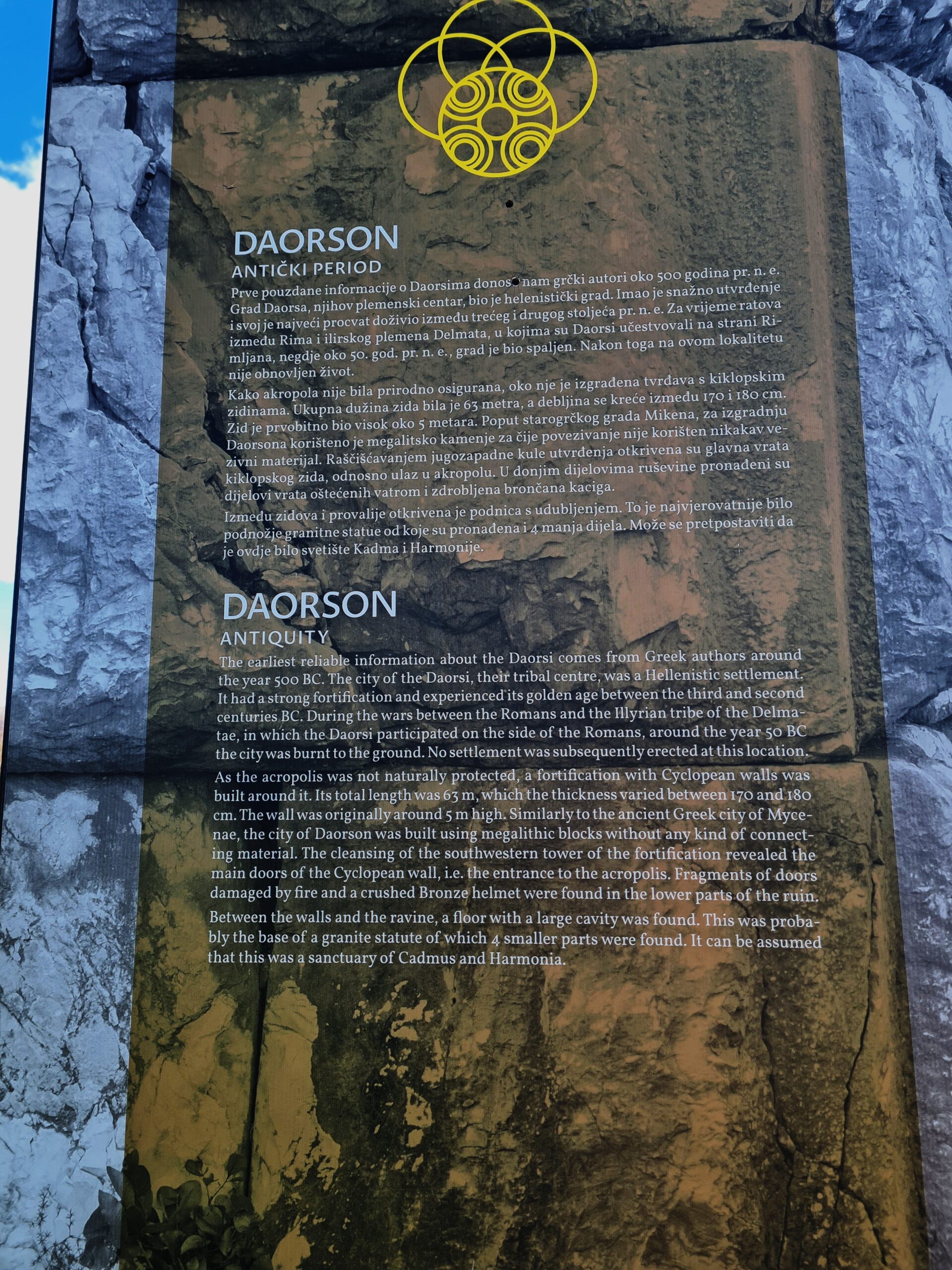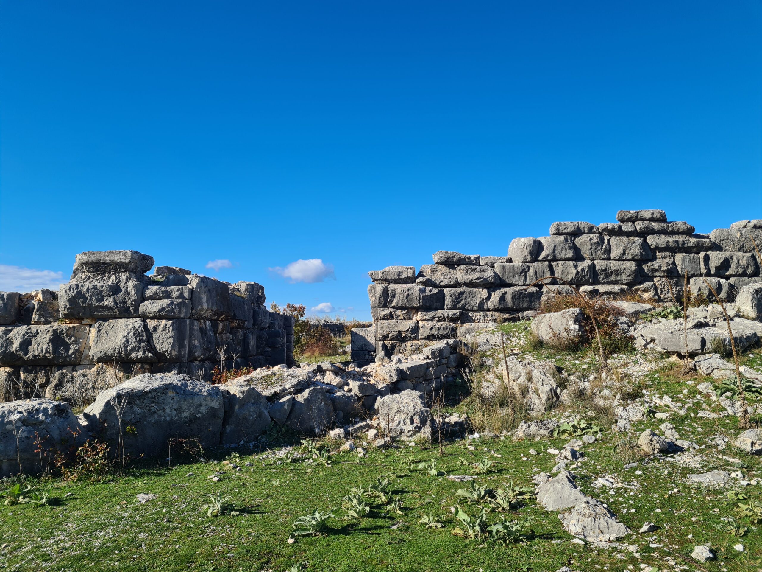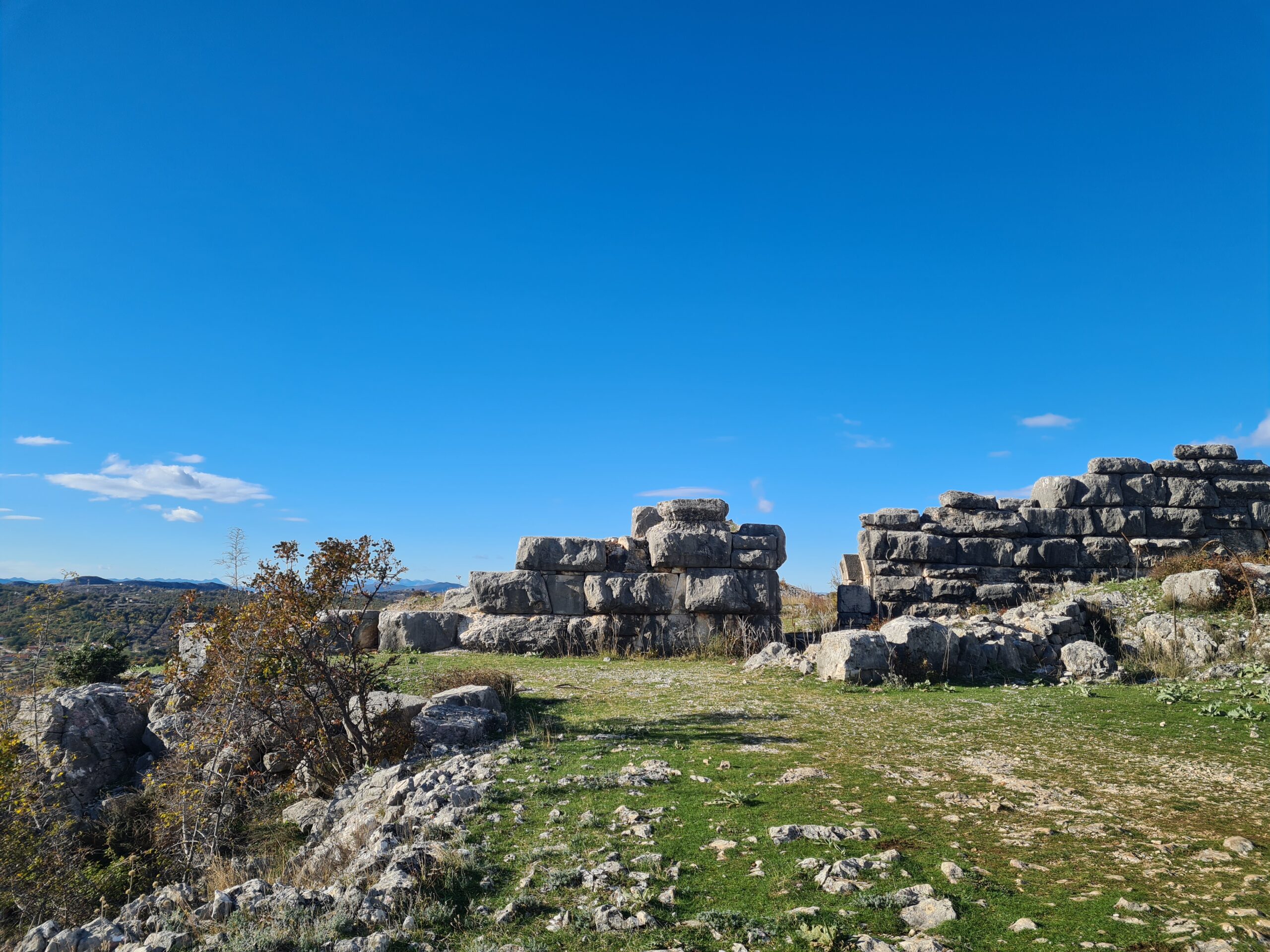 Die Stätte ist in 249 Meter Höhe gelegen. Die Mauern werden auch Zyklopenmauern genannt. Alleine die Verteidigungsmauer war 65 Meter lang, 4,2 Meter breit und bis 7,5 Meter hoch. Auf beiden Seiten der Mauer standen einst Türme.